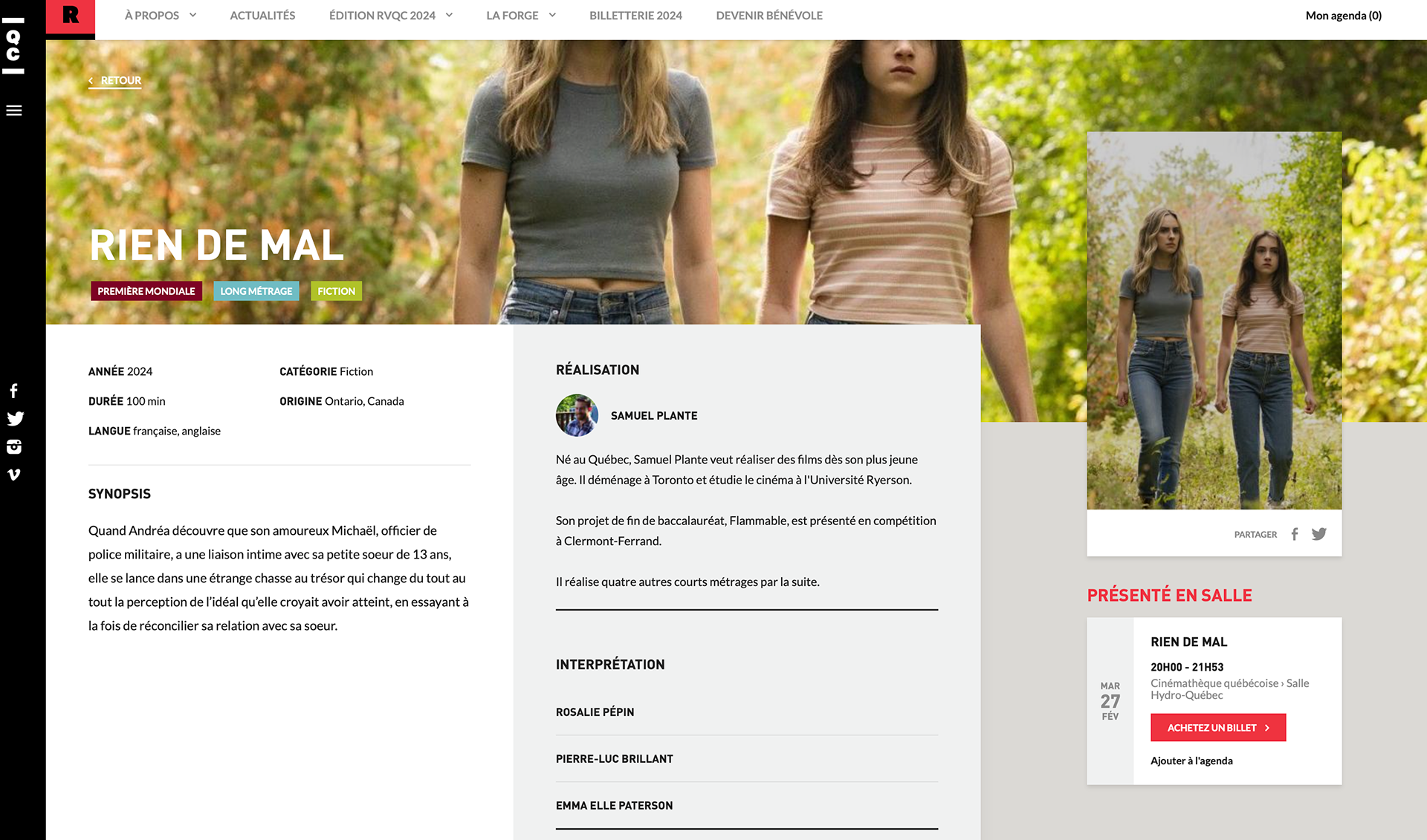 Enfin, après plusieurs années de fabrication, RIEN DE MAL sera présenté en première mondiale au Festival RVQC à Montréal, le 27 février 2024.